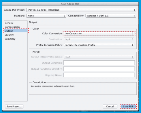 .Then select and on the right side in This option ensures that you save your file without any color prompts, and then click Save Preset..., save these PDF presets with whatever name you want, in order to .